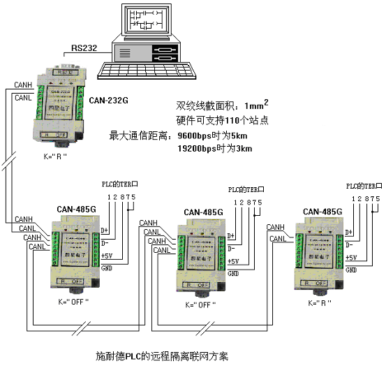 通信線的截面積比RS485通信線大,應(yīng)選1mm2的雙絞線,由于CAN-485G和CAN-232G(接電腦的RS232口)設(shè)計(jì)有二對總線端子,按圖所示接線也就不存在分支線問題了。