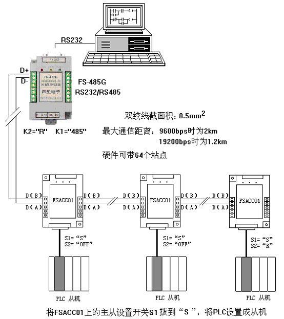 通信線選截面積為0.5mm2以上的雙絞線,將RS232/RS485隔離轉(zhuǎn)換器FS-485G上的設(shè)置開關(guān)K1撥到“485”選擇RS485模式,K2撥到“R”接入120歐終端電阻;將總線末端FSACC01上的終端電阻設(shè)置開關(guān)S2撥到“R”,接入120歐終端電阻,其它站點(diǎn)的終端電阻設(shè)置開關(guān)S2撥到“OFF”。