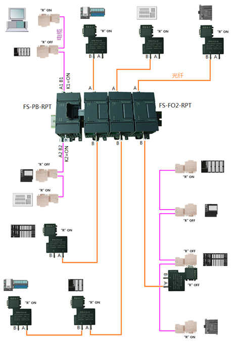用四星電子組合式光纖集線器FS-FO2-RPT-S、PROFIBUS轉光纖適配器PFB-FO2-S可實現(xiàn)PROFIBUS、MPI、PPI光纖星型連接,也可與FS-PB-RPT組合在一起,實現(xiàn)電纜和光纖混合型星型連接。