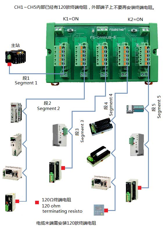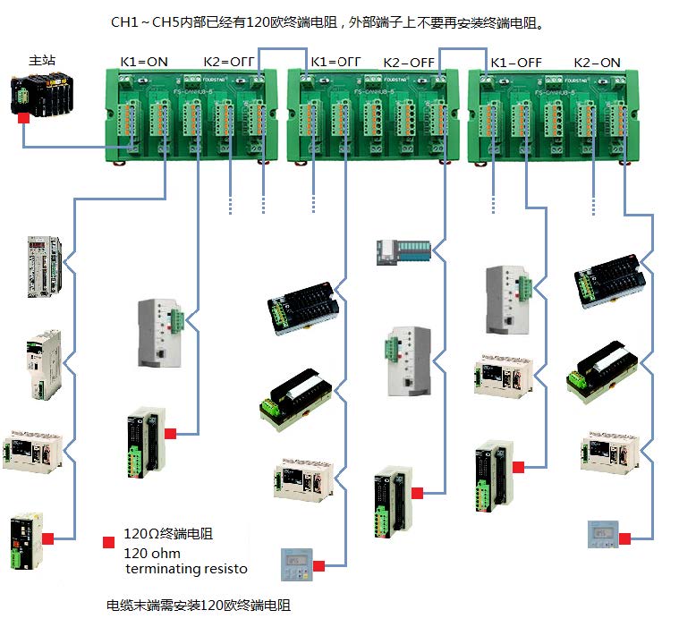 單個(gè)使用FS-CANHUB-5可實(shí)現(xiàn)5口CAN集線器。這時(shí)需將擴(kuò)展總線上的開關(guān)K1、K2均撥到ON位置,由于CAN口CH1~CH5內(nèi)部已經(jīng)有120歐終端電阻,所以只需在每路對應(yīng)的電纜末端安裝一只120歐終端電阻即可。