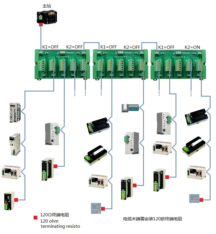 這種方案可以多出一個(gè)CAN口。擴(kuò)展總線CANH0、CANL0通常就近接主站設(shè)備,這個(gè)主站設(shè)備的CAN口需接一只120歐終端電阻,最后一臺FS-CANHUB-5右邊的開關(guān)撥到ON,除此之外的所有開關(guān)撥到OFF。如下圖所示,注意圖中開關(guān)的設(shè)置。